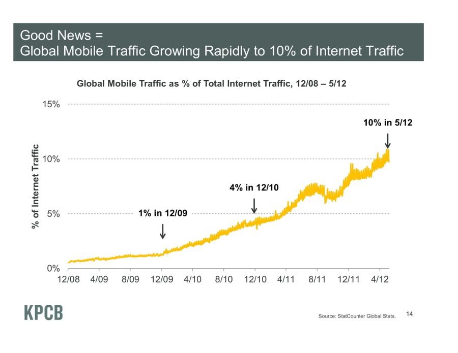 First, the numbers. Mobile traffic currently makes up 10% of global Internet traffic, as shown in the chart below, and next year more people will use mobile phones than PCs to get online, according to Gartner. Purchases made on mobile devices amounted to $6.7 billion in the U.S. last year, or about 8% of total online sales, and are expected to nearly double to $11.6 billion this year. By 2015, U.S. mobile sales are forecast to reach $31 billion.